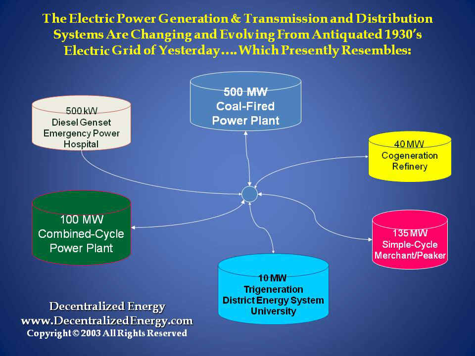 The electric grid of the 21st century (see slide below) will be Decentralized, Smart, Efficient and provide "carbon free energy" and “pollution free power” to customers who remain on the electric grid. Some customers will choose to dis-connect from the grid entirely. (Electric grid represented by the small light blue circles in the slide below.)